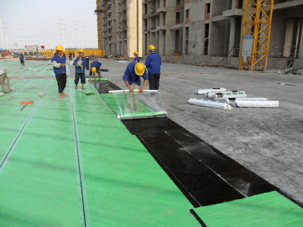 抬铺法: 把已剪好的卷材反铺于基面上(即是底部隔离纸朝上),待剥去卷材全部隔离纸后,再将水泥素浆刮涂在卷材粘结面和基面待铺位置,然后分别由两人从卷材的两端配合抬起,翻转和铺贴在待铺位置上。卷材与相邻卷材之间为平行搭接,待长、短边搭接施工时再揭除上下卷材搭接隔离膜。